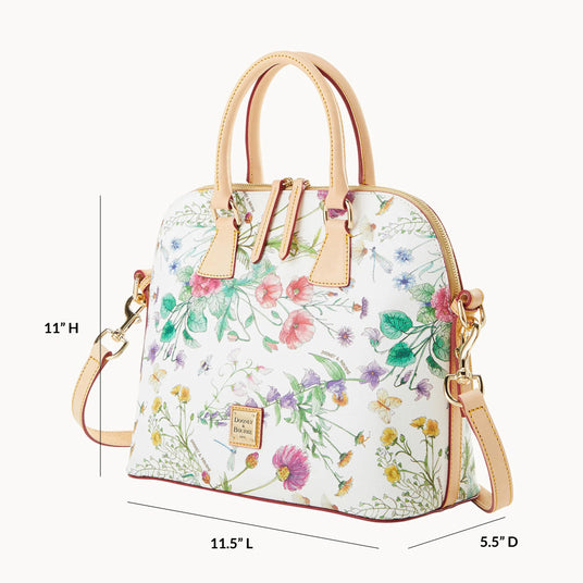 A structured look with a lovely botanical print, crafted from lightweight Italian coated cotton and classic leather.Details