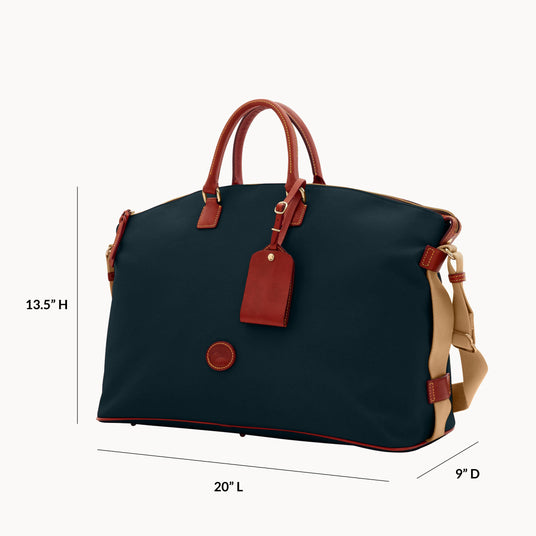 The Nylon Weekender is generously sized to fit everything you need for a few days away. There’s room for clothing, shoes, toiletries, a tablet or laptop, and your favorite book, with space left for travel extras like chargers or snacks. The wide zip-top opening makes packing and unpacking effortless, while interior slip and zip pockets keep smaller items organized and easy to reach.