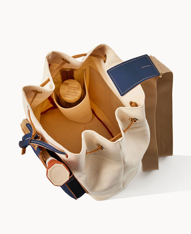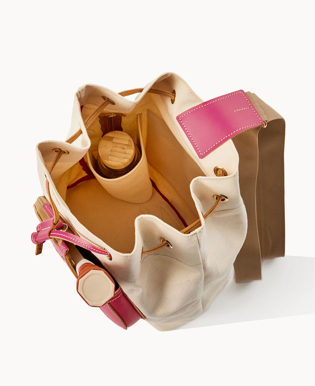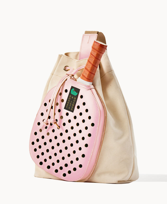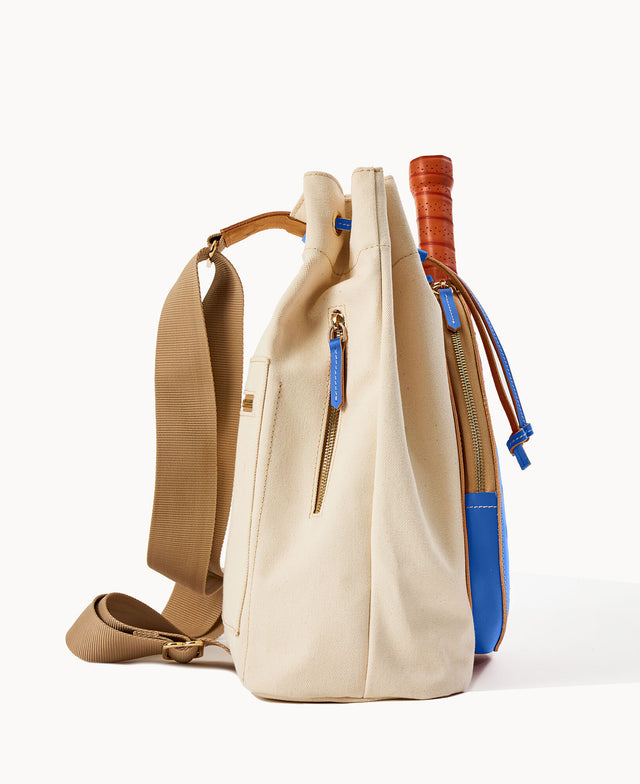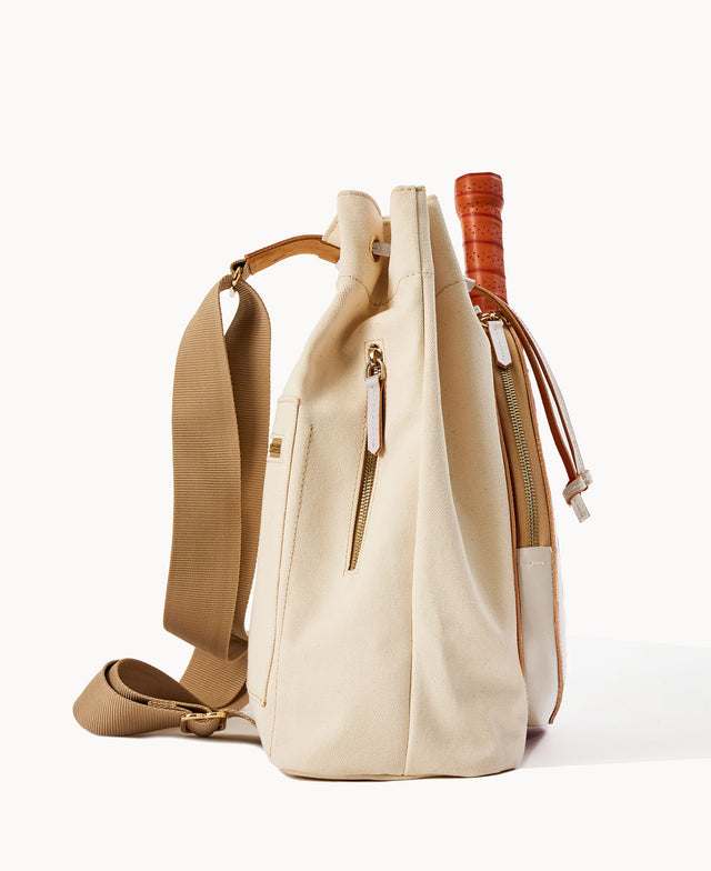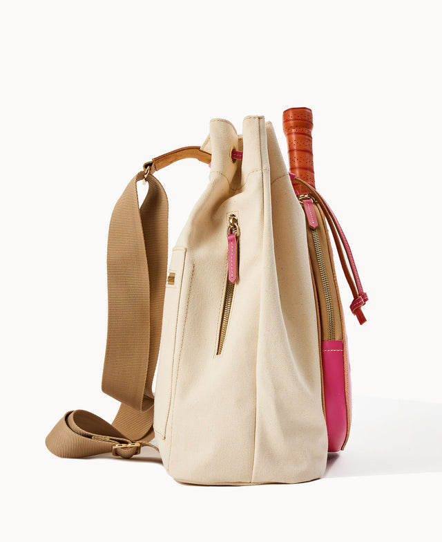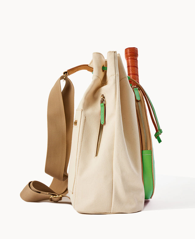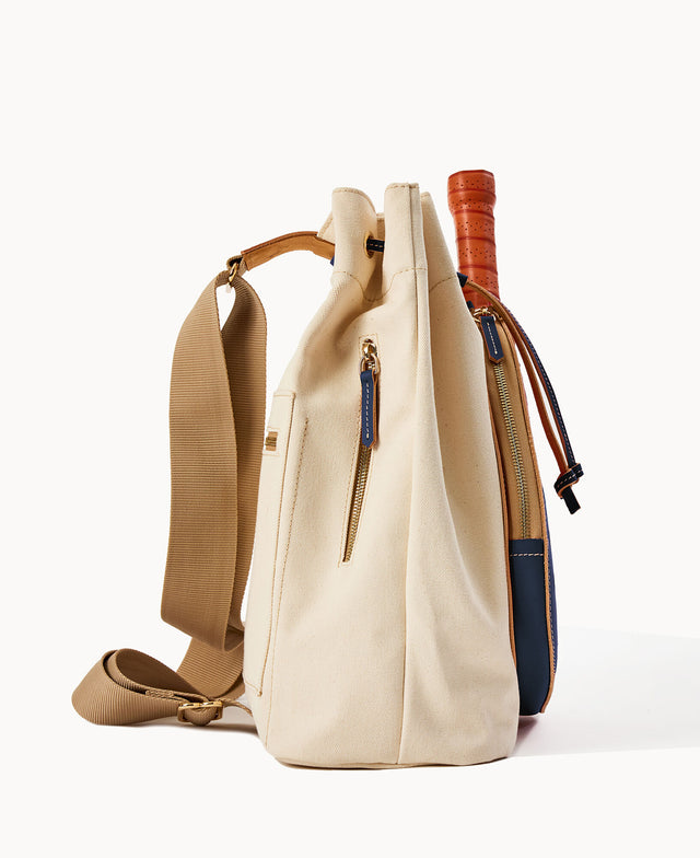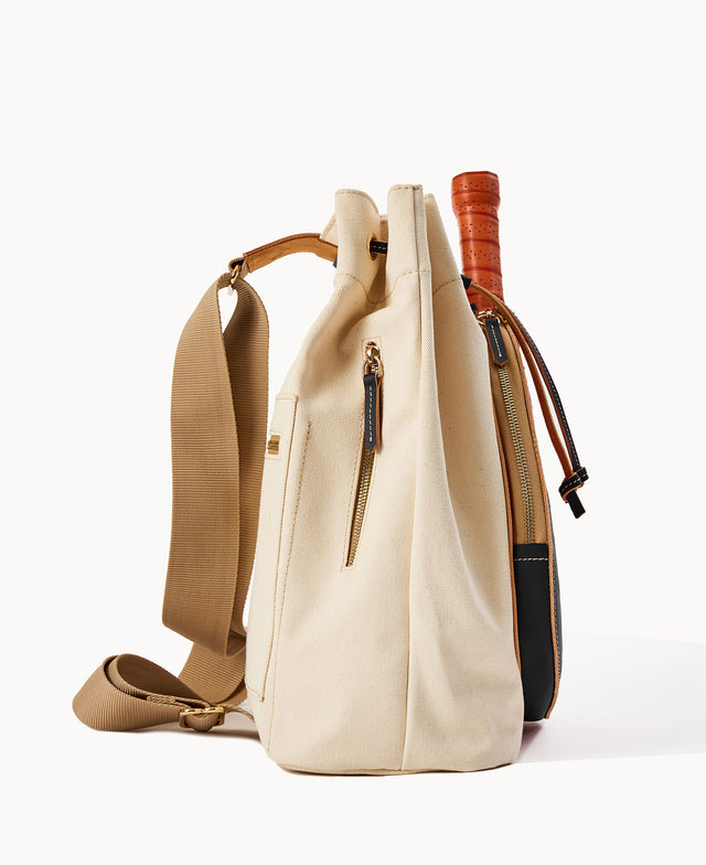 The Canvas Pickleball Sling offers a thoughtful balance of sport and style with ample space for your court essentials. Its front compartment securely holds a pickleball paddle, while the roomy main interior easily fits extra balls, a water bottle, a towel, and small personal items like your wallet, phone, and keys. A drawstring closure provides easy access and a casual finish, while the structured shape ensures your gear stays organized. Designed for effortless wear, the adjustable strap allows the bag to be carried comfortably across the body or over one shoulder. Ideal for practice sessions, matches, or casual outings, this athletic-inspired silhouette transitions seamlessly from the court to your daily routine, combining practicality with refined, sporty elegance.