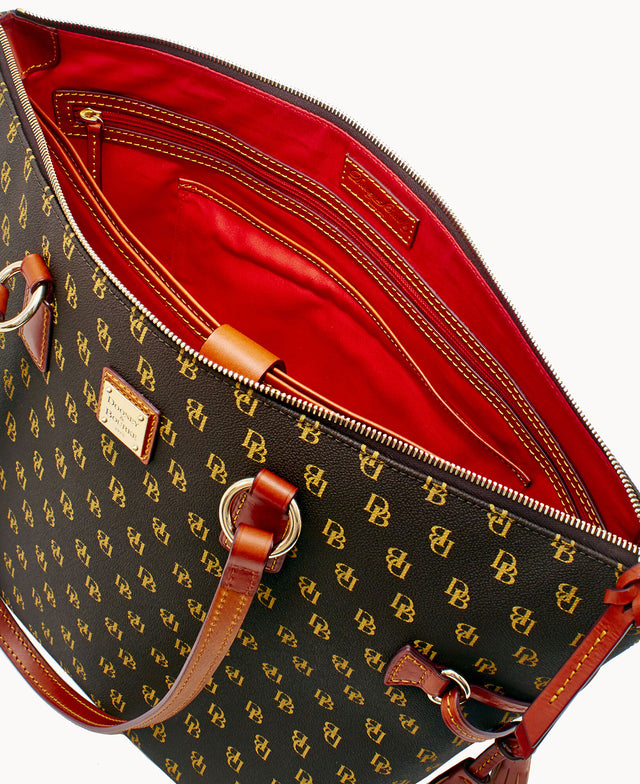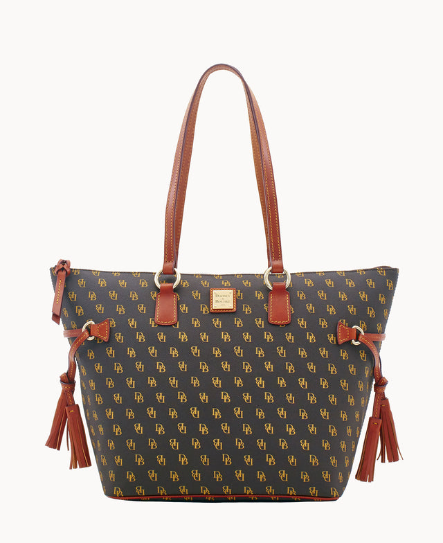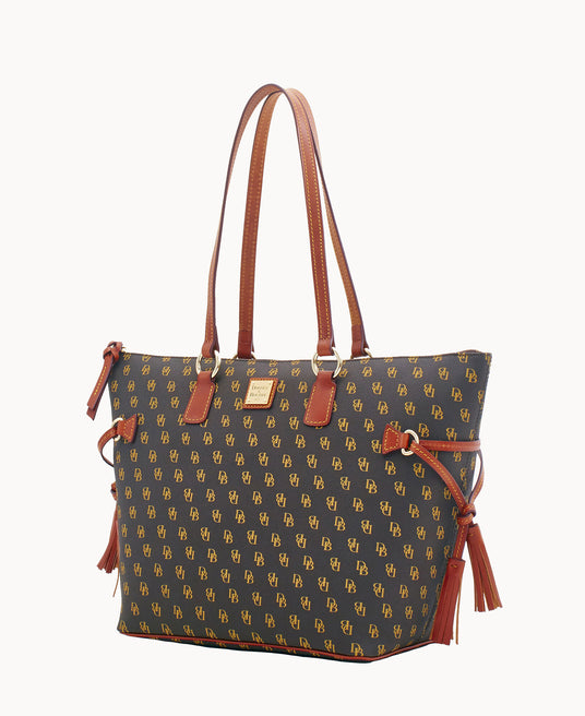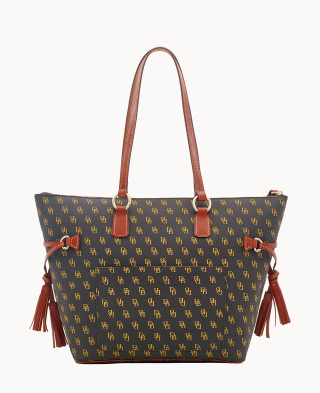 The Gretta Collection offers elevated silhouettes for your everyday life swathed in our petite logo print with leather trim. Accented with oversized handle rings and side tassels, this tote is a stylish but practical carryall for work and travel.Details