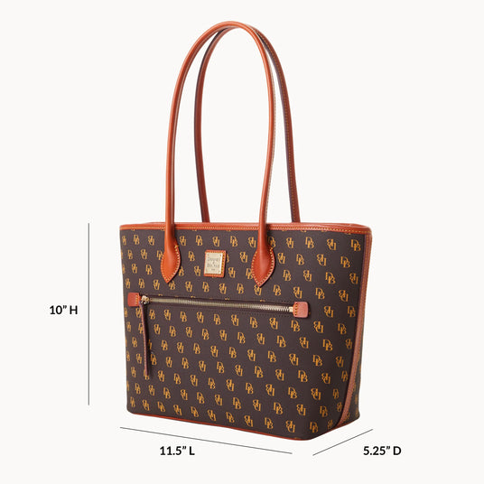 The Gretta Collection is made using sleek coated canvas printed with our petite logo and trimmed with crisp Vacchetta leather. You can't get more essential than this everyday tote, complete with zippered pockets, metal feet, and an interior clip for your keychain.Details