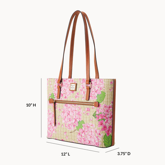 Sized for daily versatility, the Hydrangea Basketweave Shopper is tailored to hold more than your basics while remaining polished and streamlined. The open interior accommodates a book or small planner alongside your wallet, glasses case, compact cosmetic bag, and portable charger, with vertical room for a slim water bottle to stand upright. Multiple interior pockets let you separate tech accessories from personal items, while the secure zip pocket is ideal for storing a passport or small card case when traveling. The designated cell phone pocket and interior key hook reduce dig time, and the exterior zip pocket keeps essentials like house keys or a parking ticket within easy reach.
