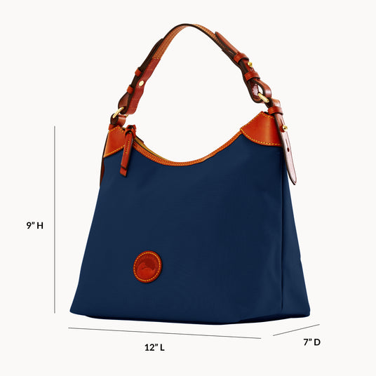 The spacious Nylon Large Erica shoulder bag offers plenty of room for your daily essentials, while still being lightweight and airline-compliant. It easily fits under an airline seat while carrying a tablet, full-size wallet, makeup pouch, sunglasses, keys, and even a small water bottle or planner. The center zip divider compartment helps separate and secure belongings, while four interior pockets, including a cell-phone pocket, make it easy to stay organized. An interior zip pocket and key hook keep your valuables close and accessible.