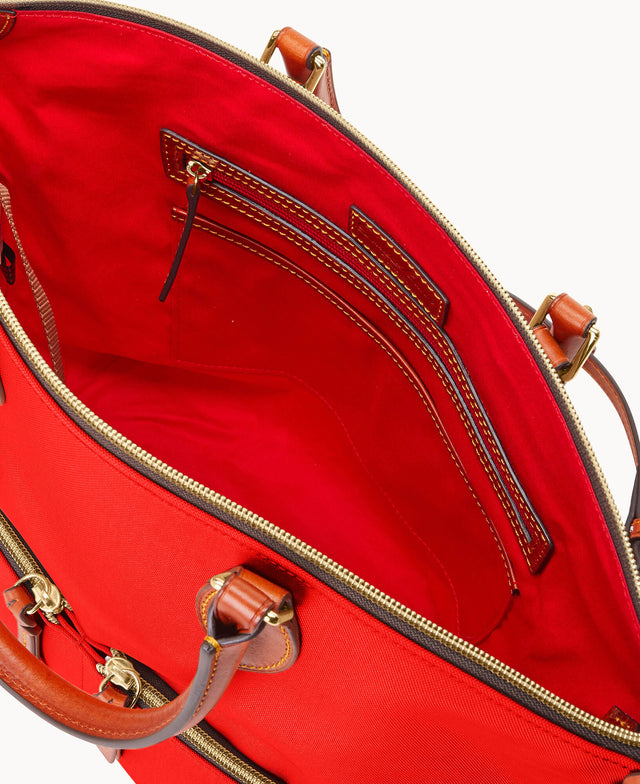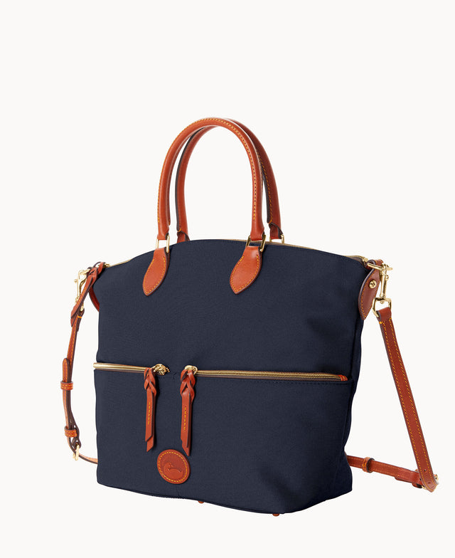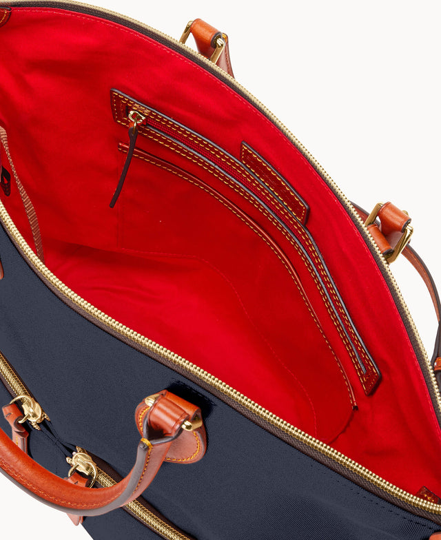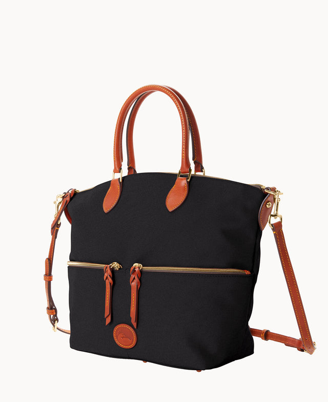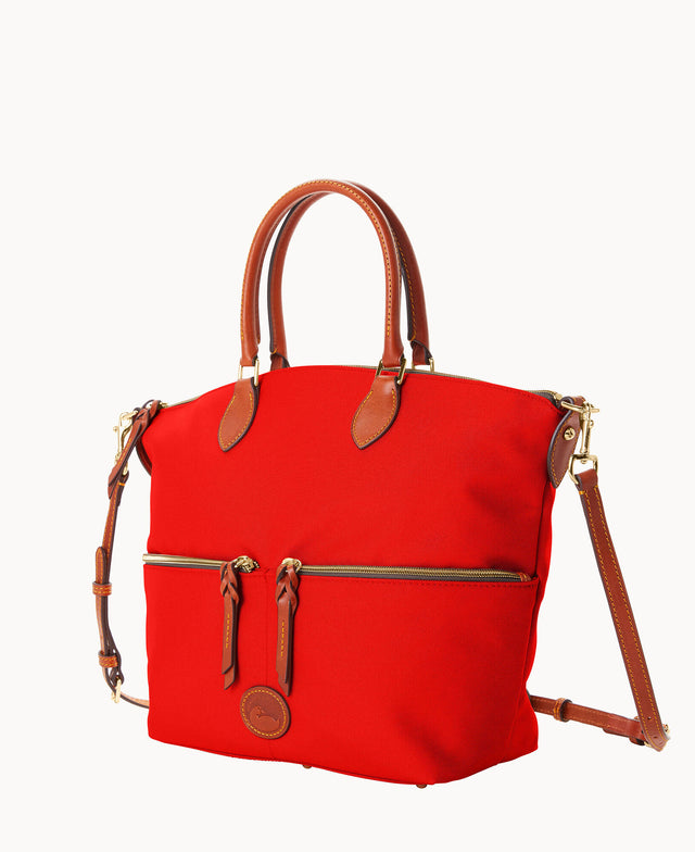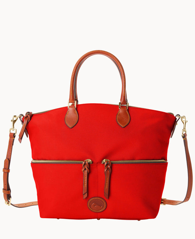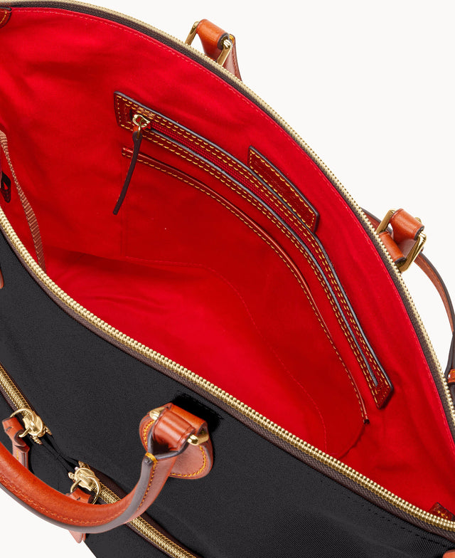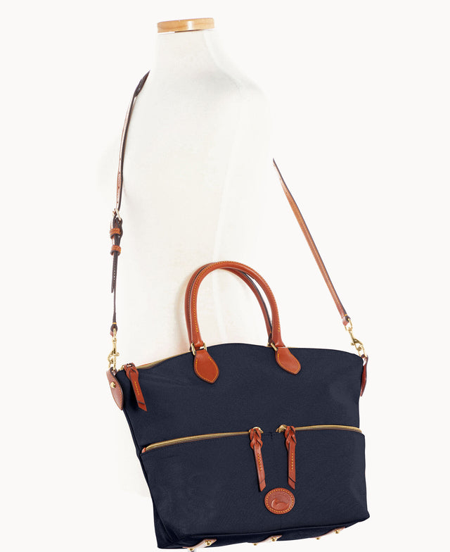 Our Nylon Collection combines exceptionally durable fabric with leather trim for accessories that are both functional and lightweight. This satchel is one of Dooney & Bourke's original styles. It speaks to our legacy of crafting and designing timeless, iconic shapes and features a variety of carrying options.