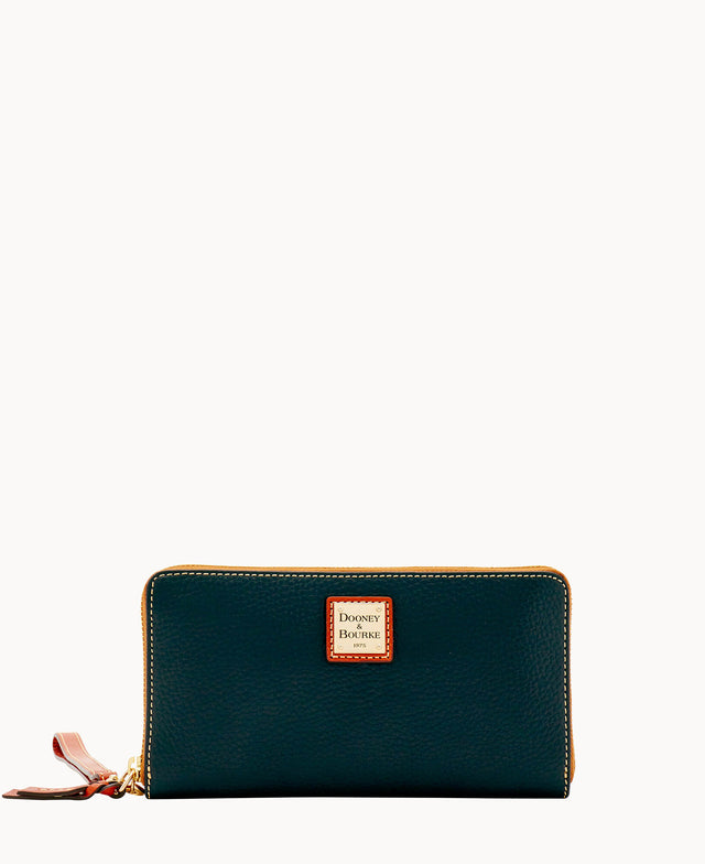 The Pebble Grain Large Zip Around Wristlet has been thoughtfully designed to hold your smartphone, cash, cards, and keys while maintaining a slim, elegant silhouette. Inside, two main compartments, a center zip pocket, and twelve credit card slots provide structured organization, so everything has its place. The zip-around closure keeps your belongings secure, and the detachable wrist strap (7″ length) makes it easy to carry on its own or tuck into your favorite Dooney handbag.