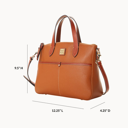 The rich texture and exceptional durability of Pebble Grain leather has made it one of our most popular collections. This everyday satchel has a slim profile and sleek exterior pockets. We love wearing this with our favorite blazer and denim.Details