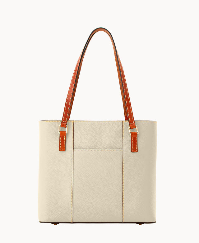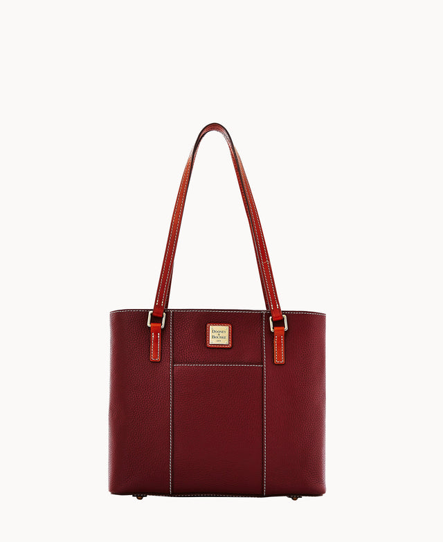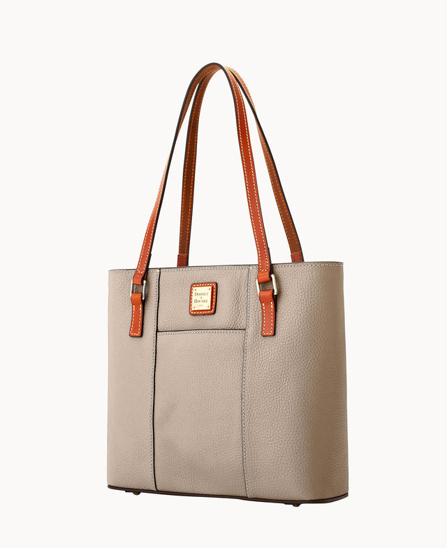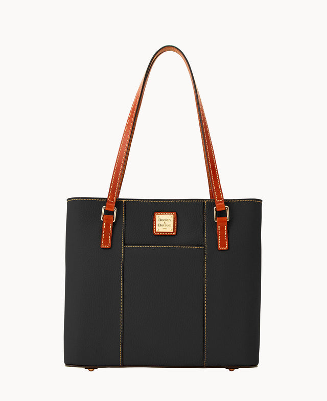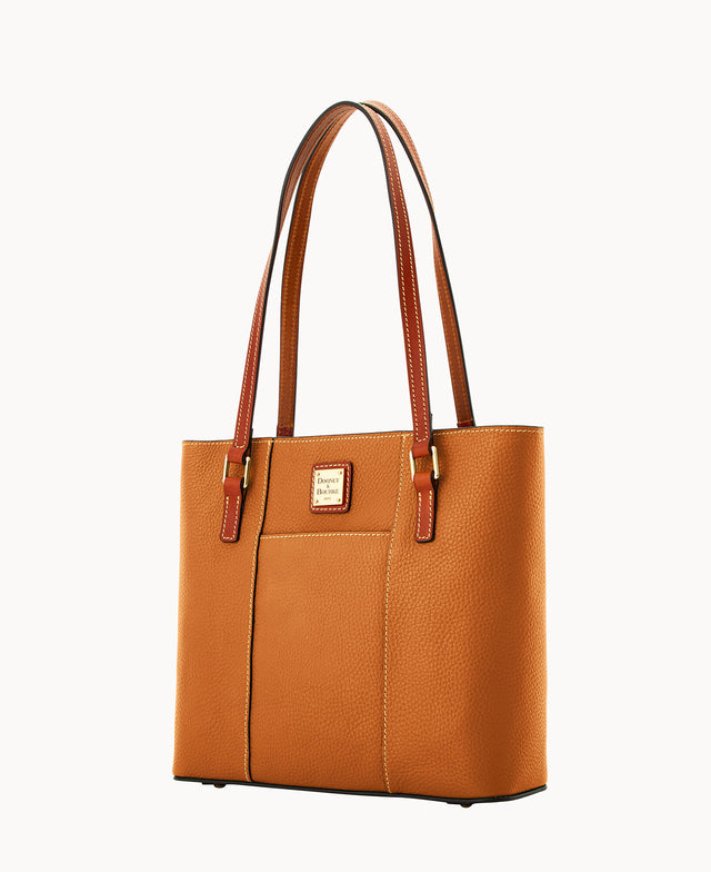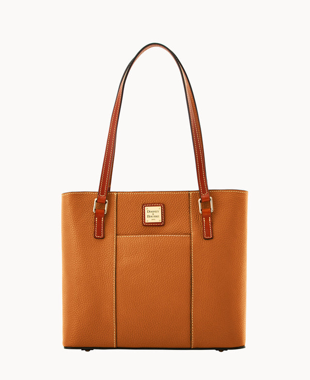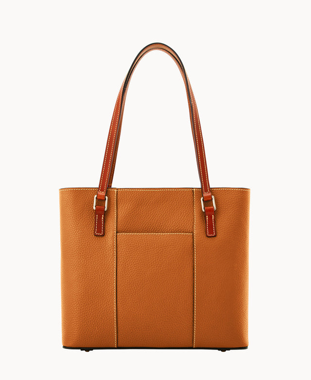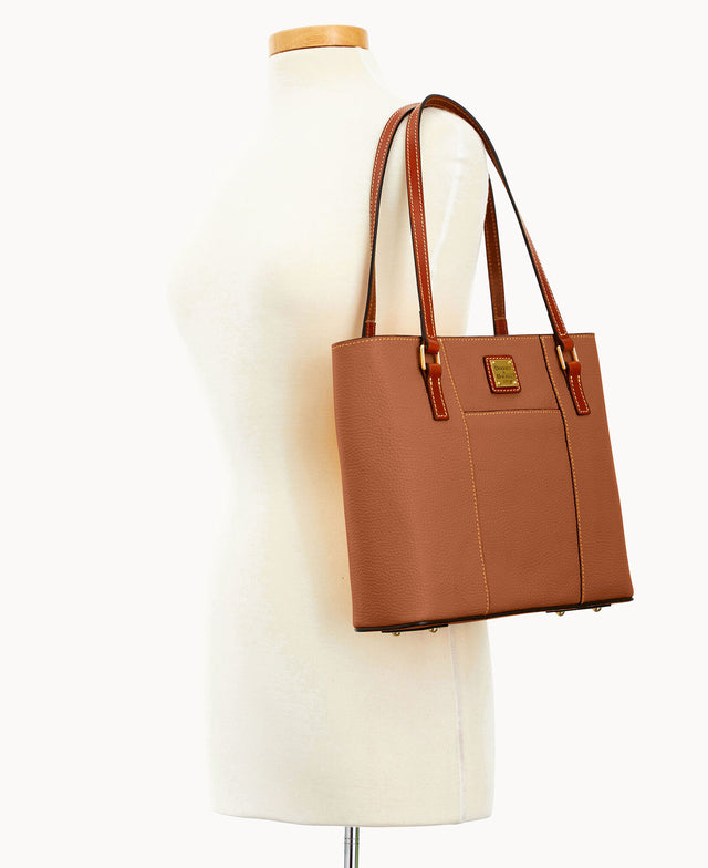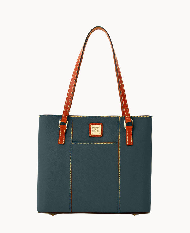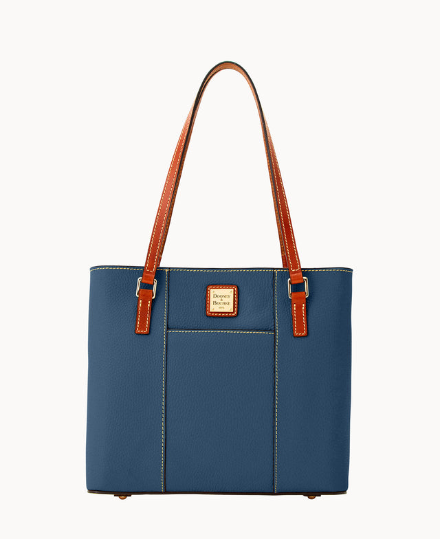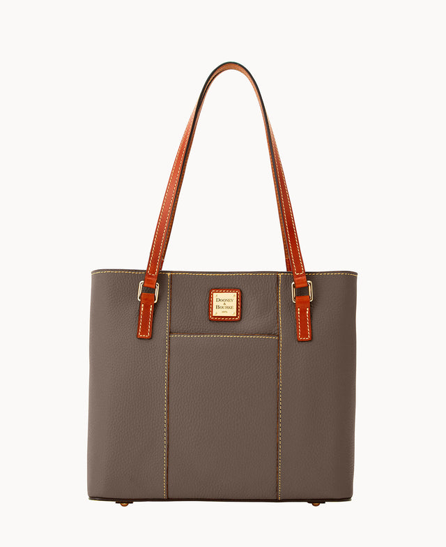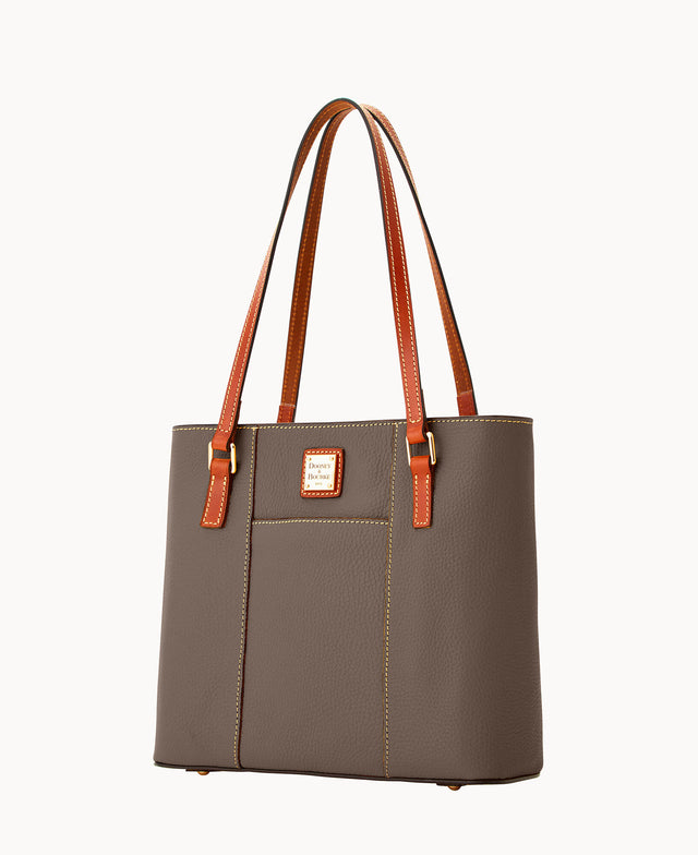 This essential tote, made from long-lasting pebble leather with a rich finish, has all the features you need: protective feet on the bottom, an exterior slip pocket, comfortable leather straps, and a zippered closure for security.Details