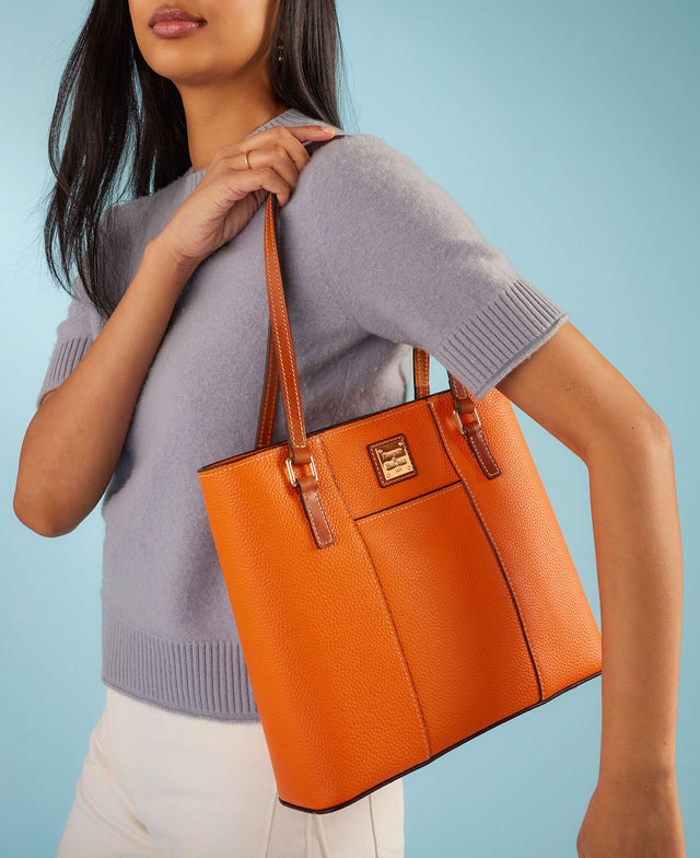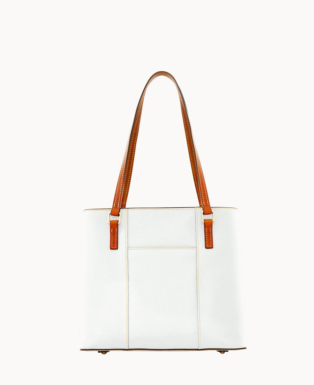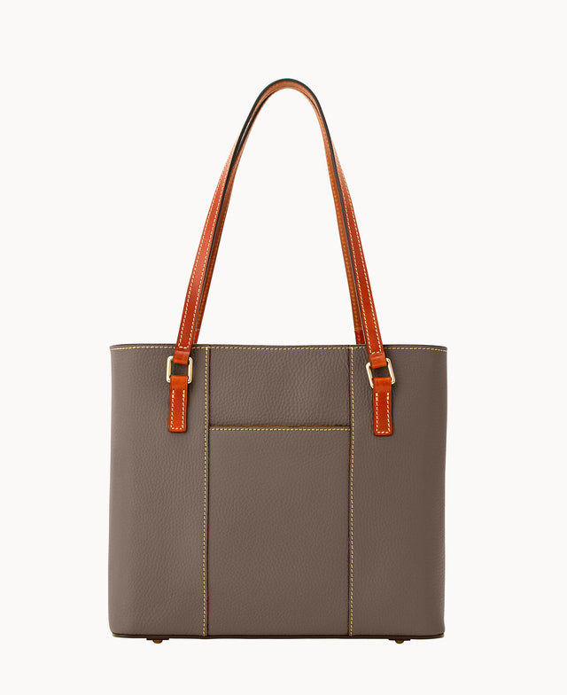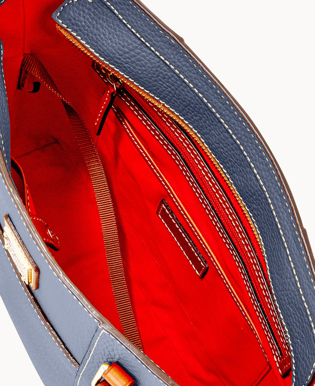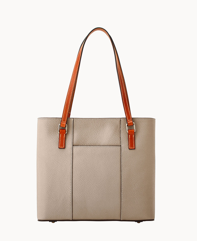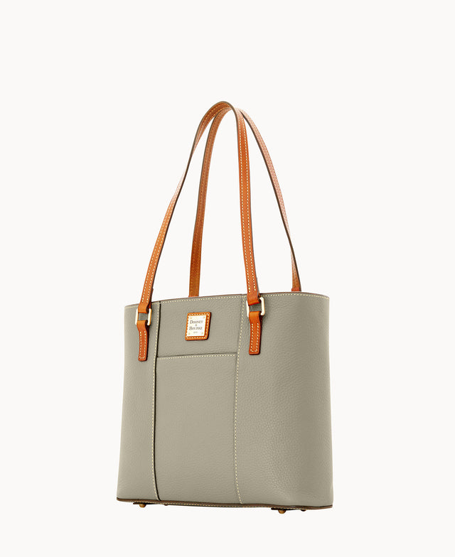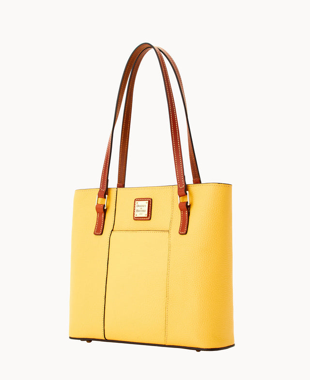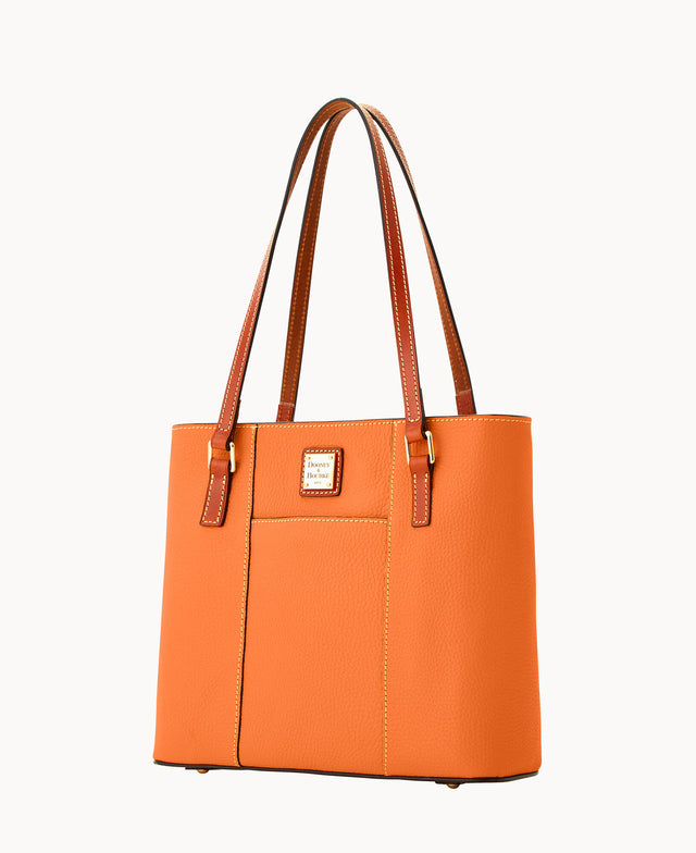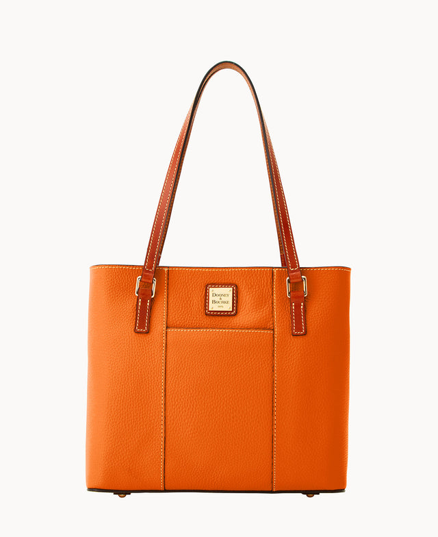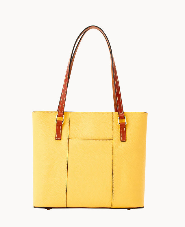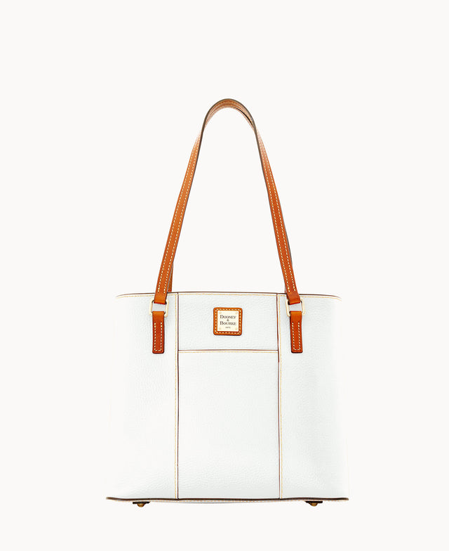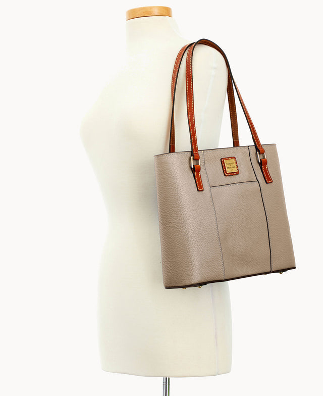 This essential tote, made from long-lasting pebble leather with a rich finish, has all the features you need: protective feet on the bottom, an exterior slip pocket, comfortable leather straps, and a zippered closure for security.Details