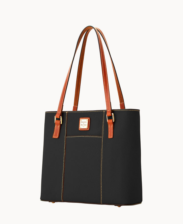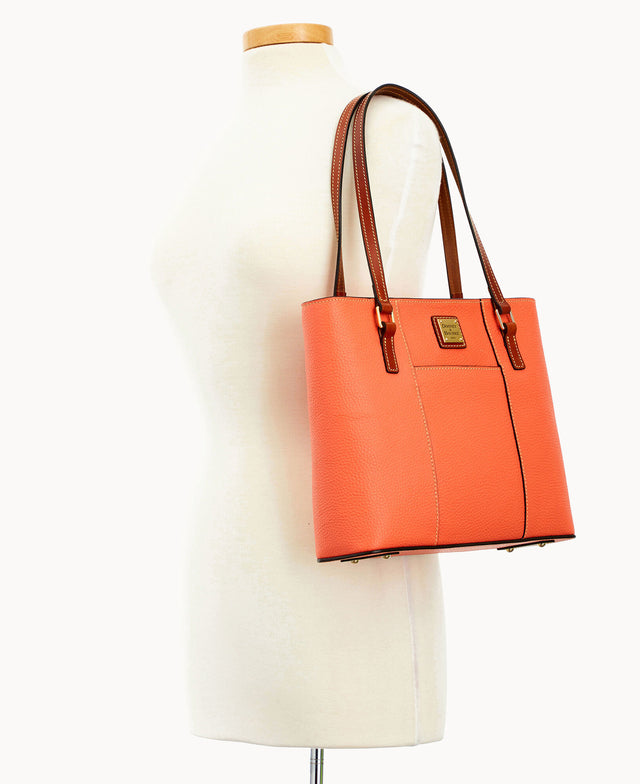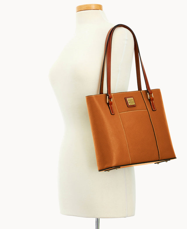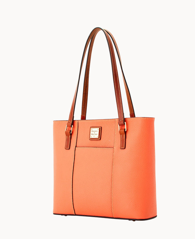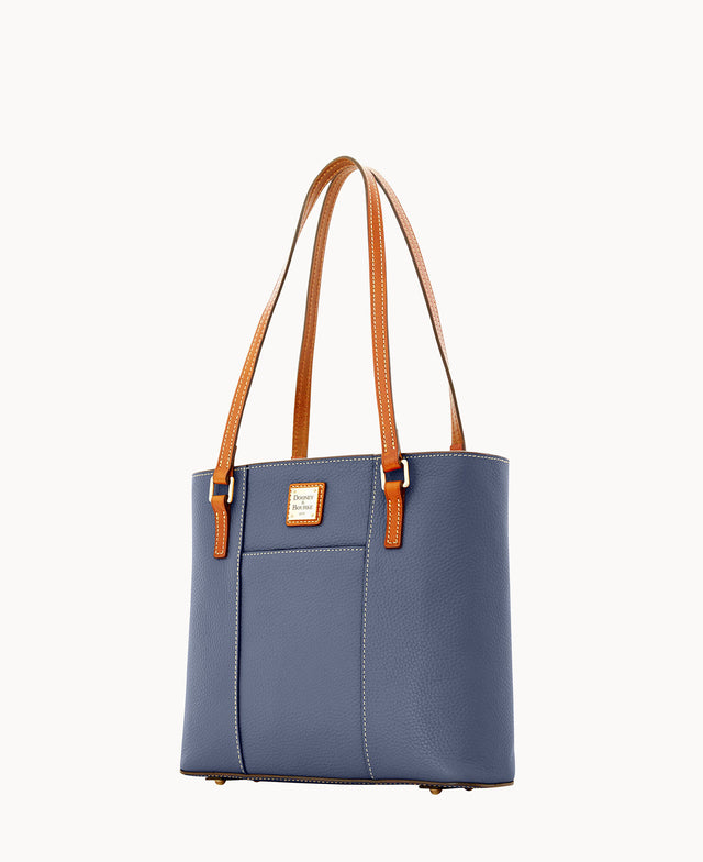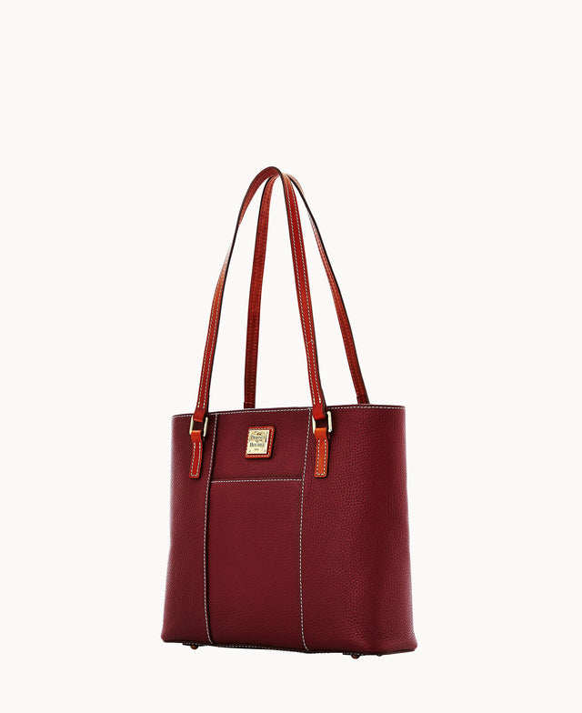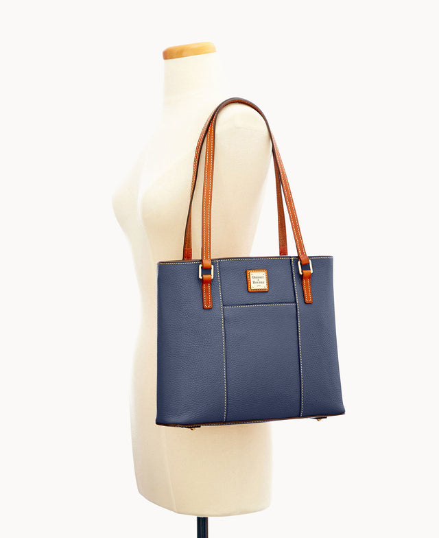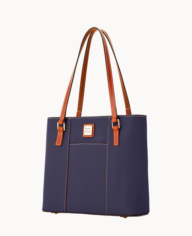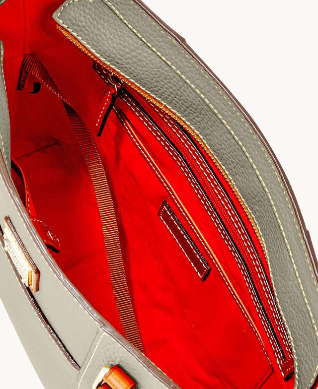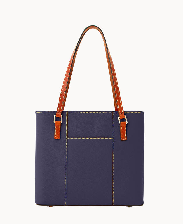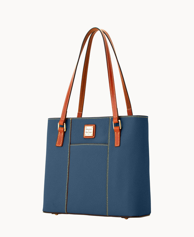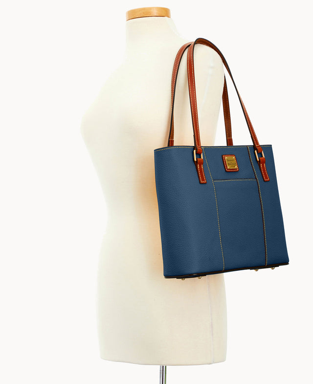 This essential tote, made from long-lasting pebble leather with a rich finish, has all the features you need: protective feet on the bottom, an exterior slip pocket, comfortable leather straps, and a zippered closure for security.Details