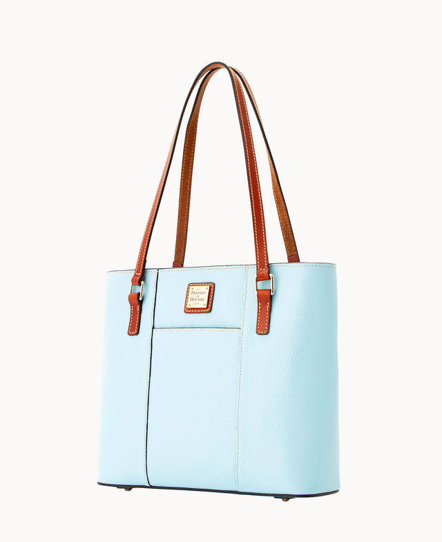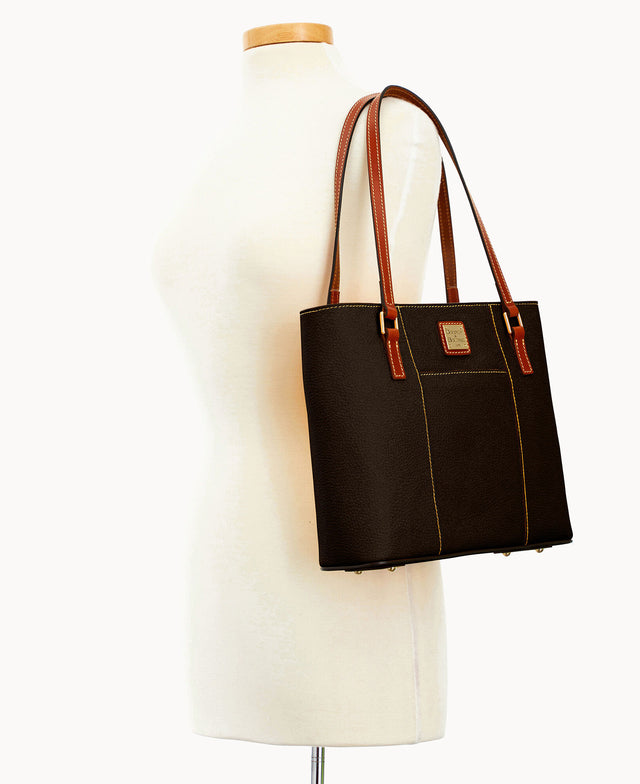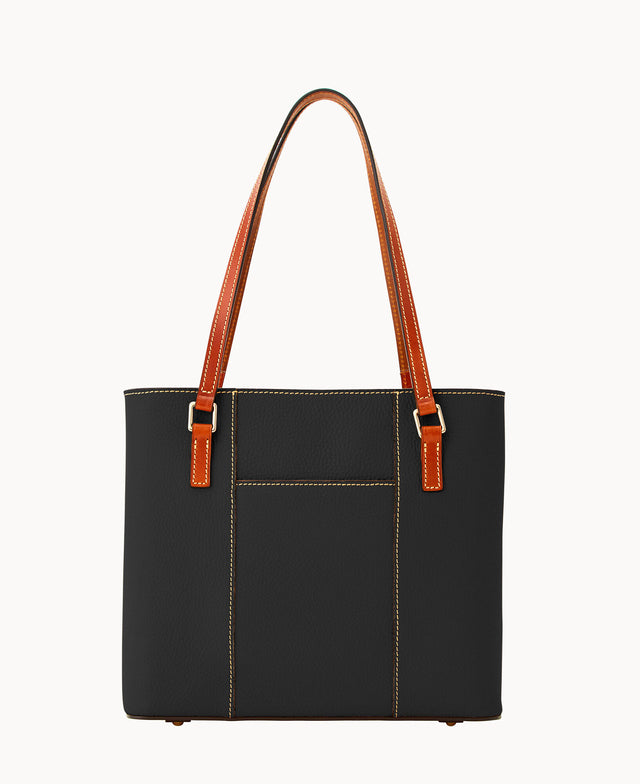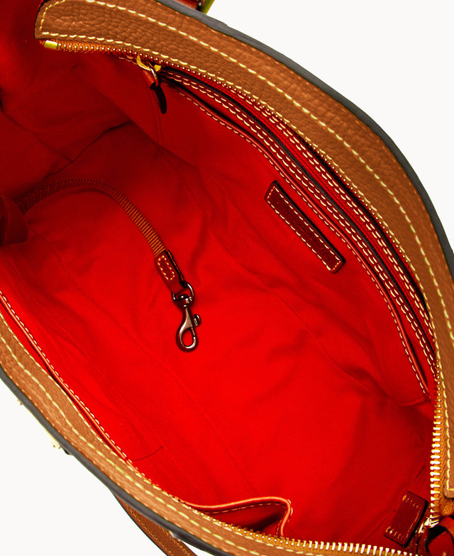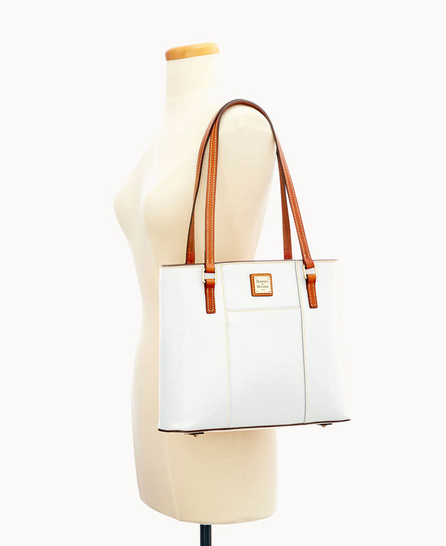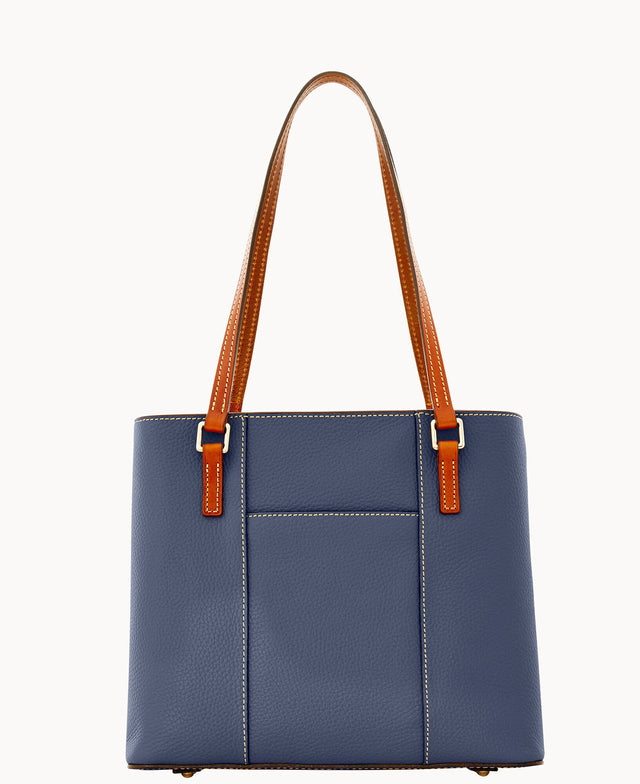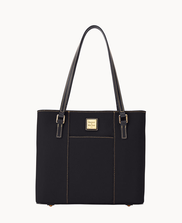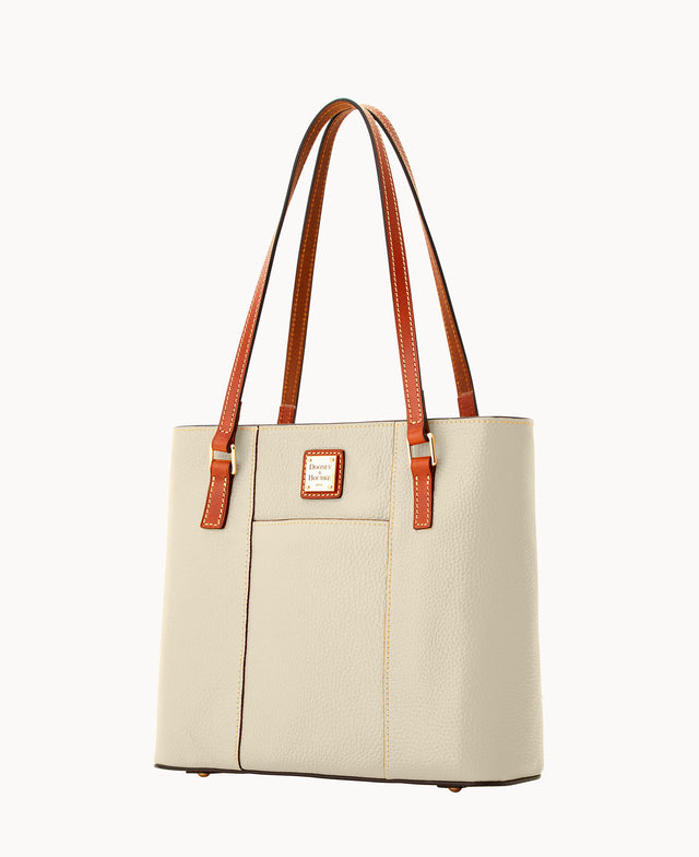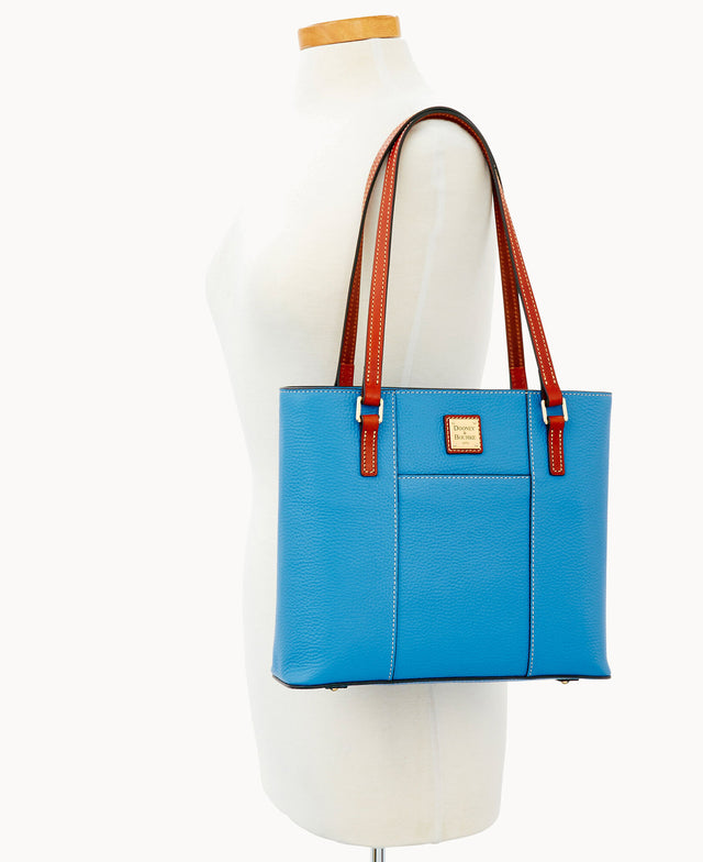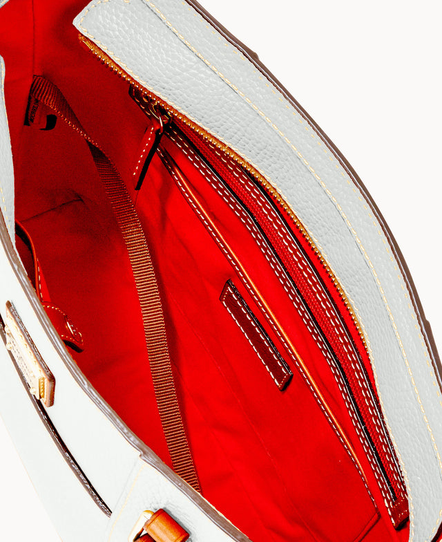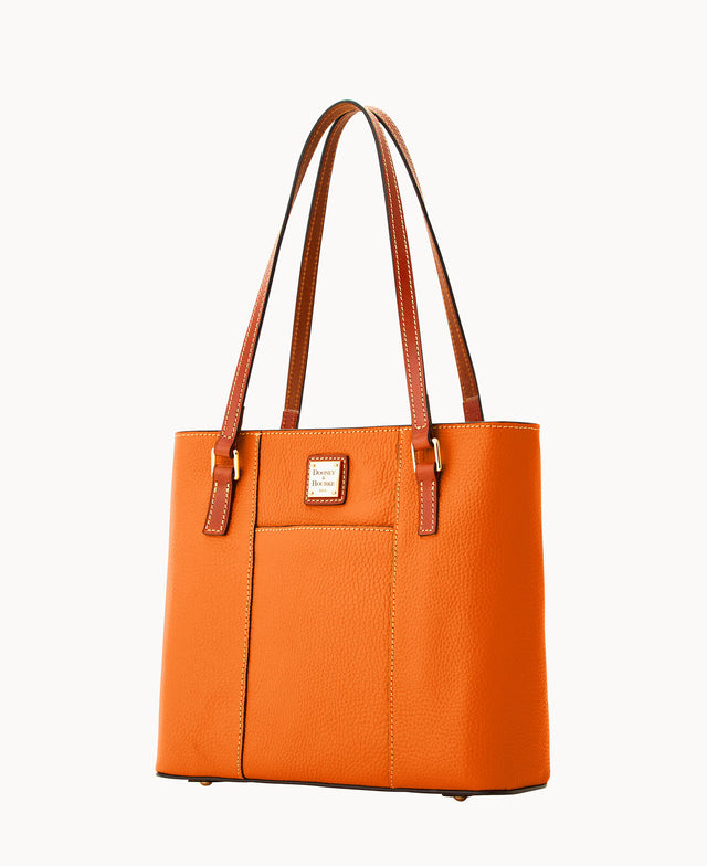 This essential tote, made from long-lasting pebble leather with a rich finish, has all the features you need: protective feet on the bottom, an exterior slip pocket, comfortable leather straps, and a zippered closure for security.Details