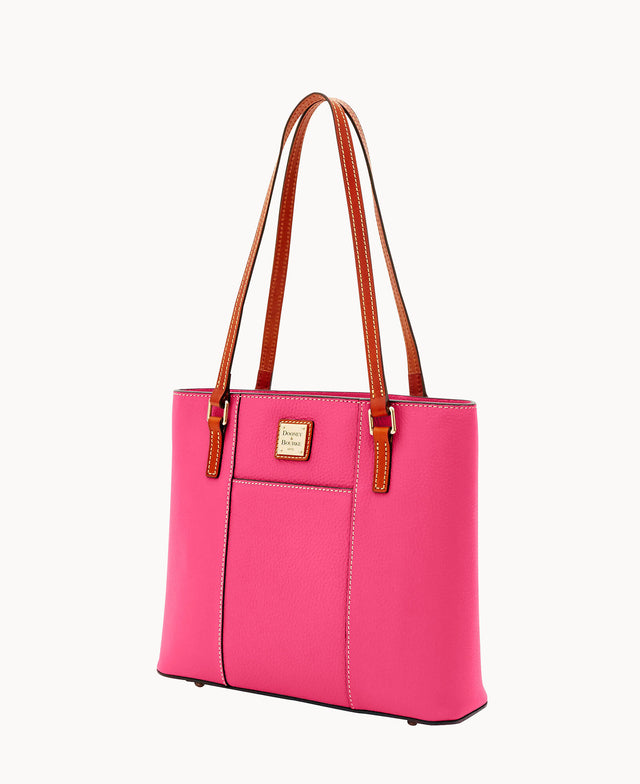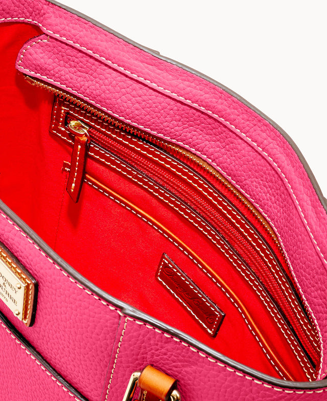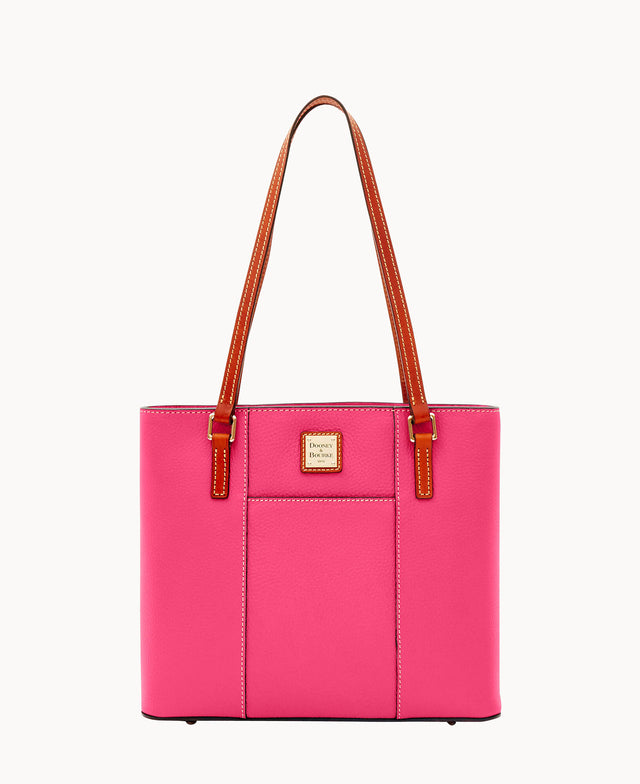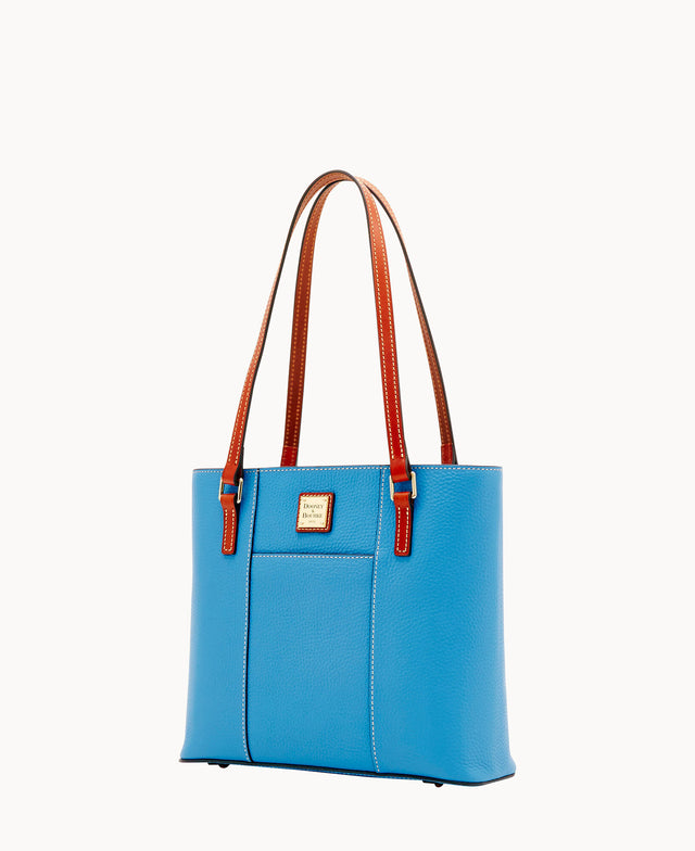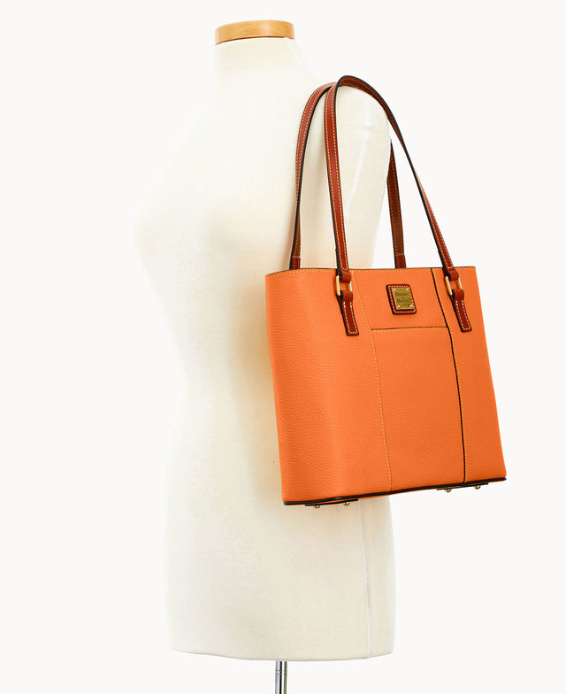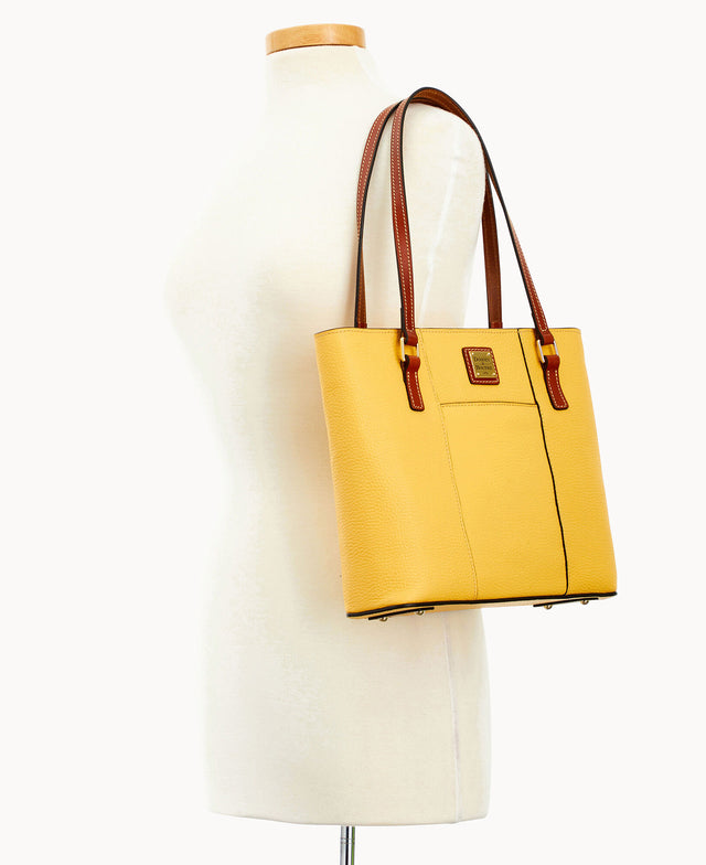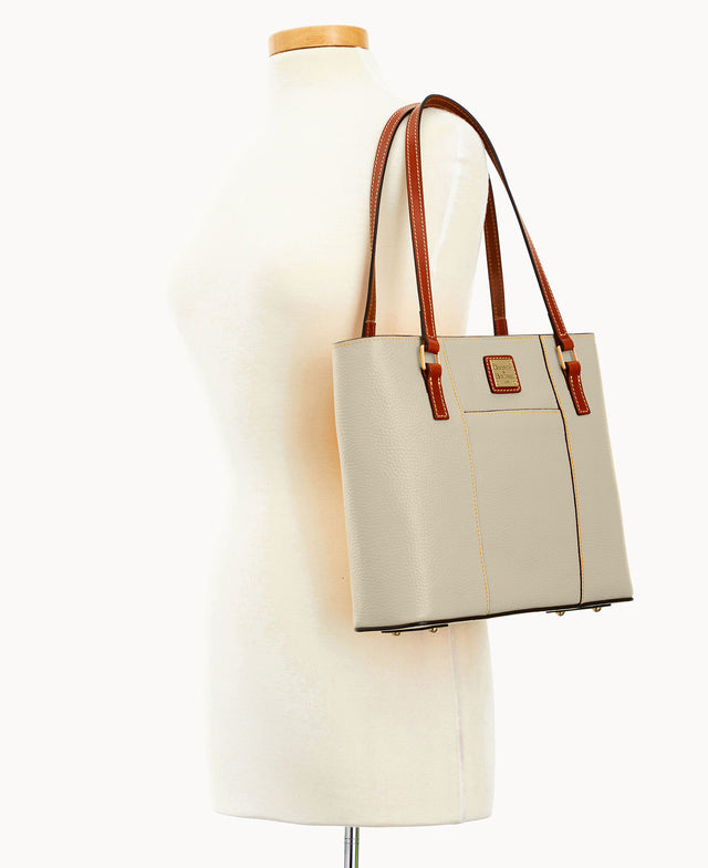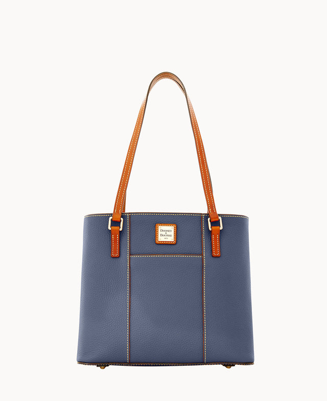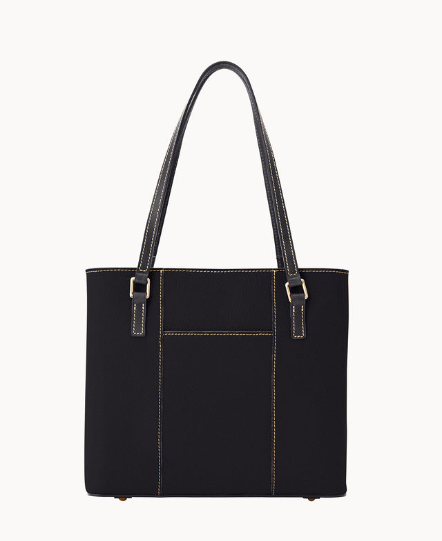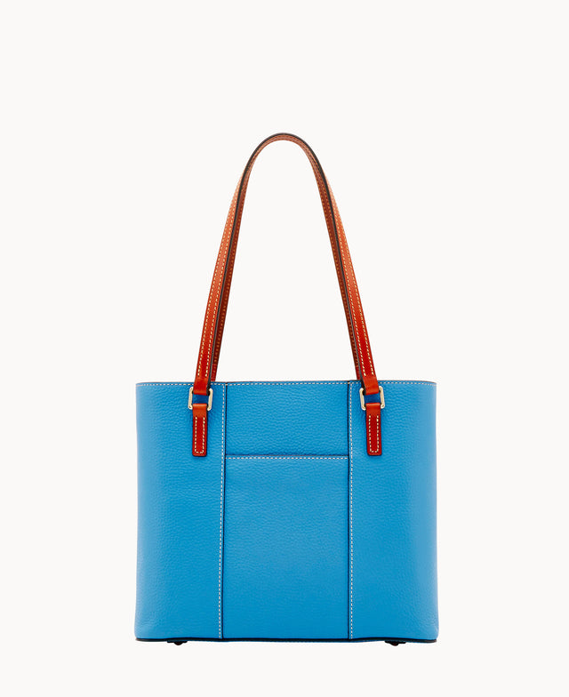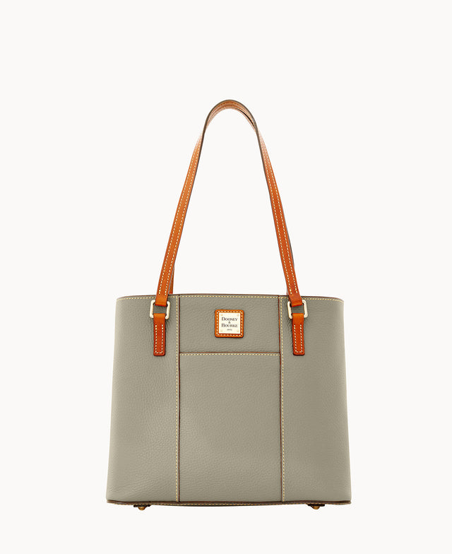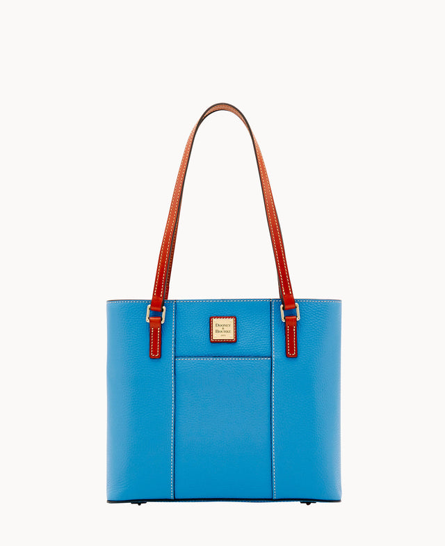 This essential tote, made from long-lasting pebble leather with a rich finish, has all the features you need: protective feet on the bottom, an exterior slip pocket, comfortable leather straps, and a zippered closure for security.Details