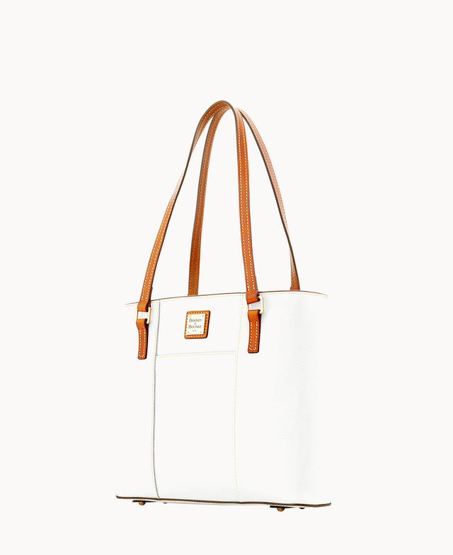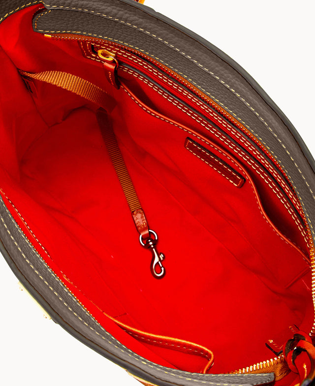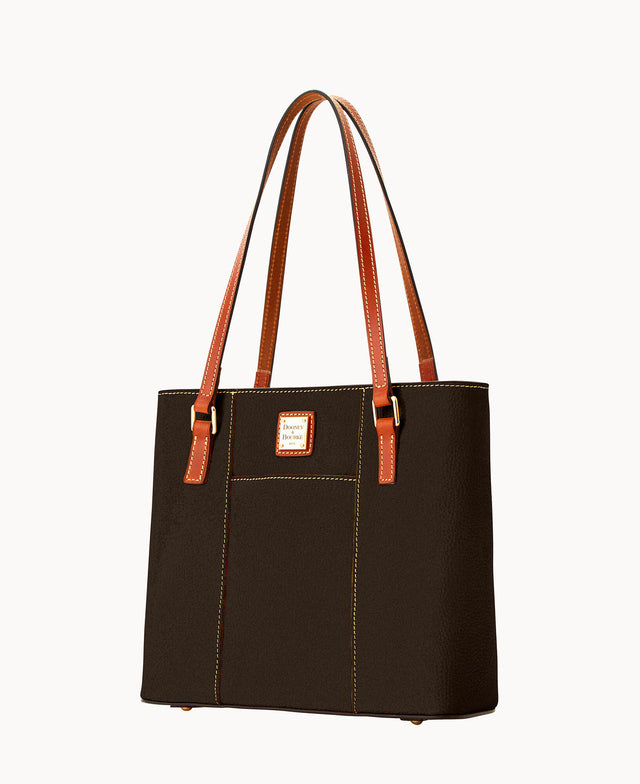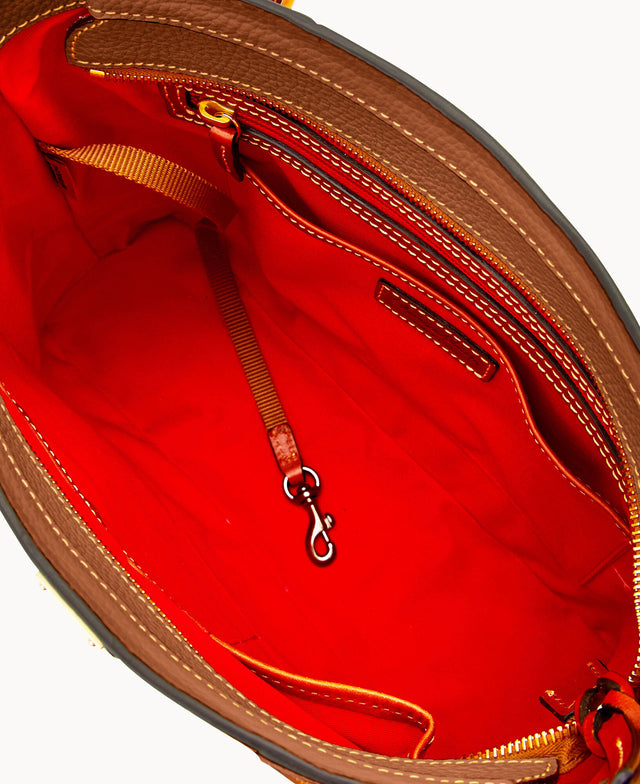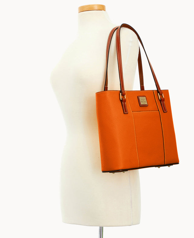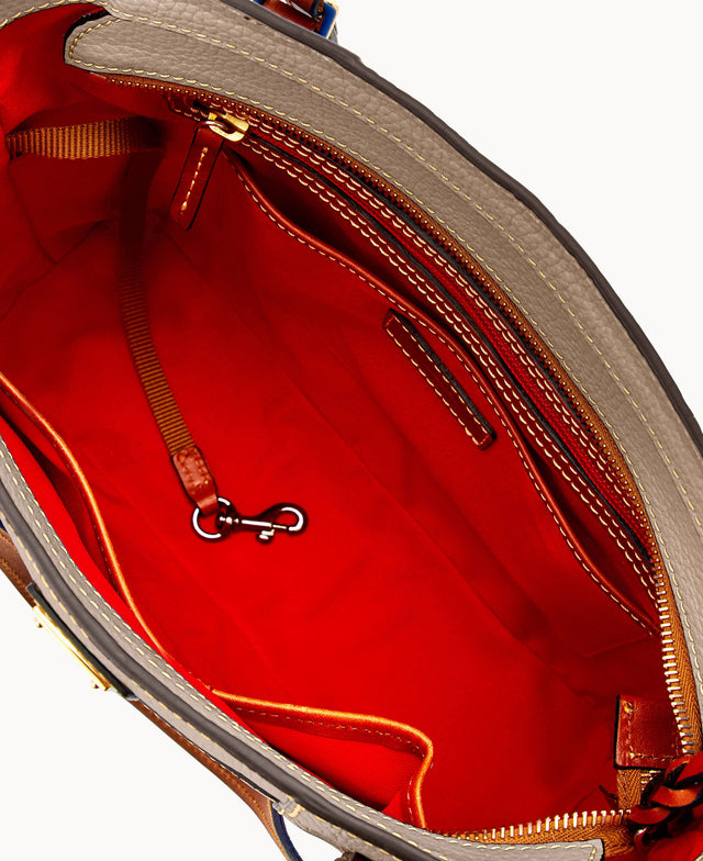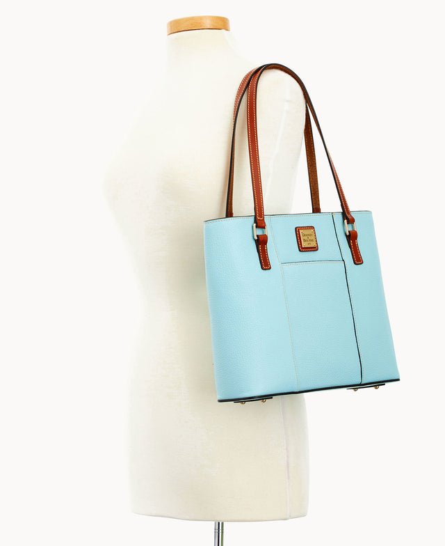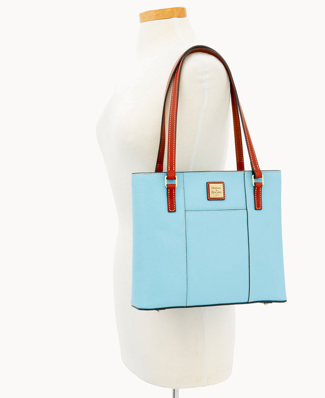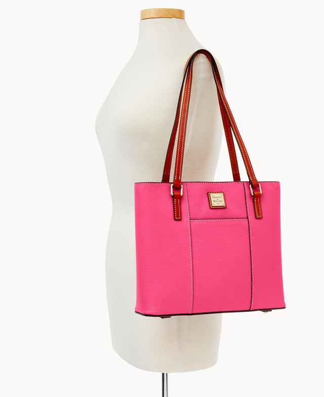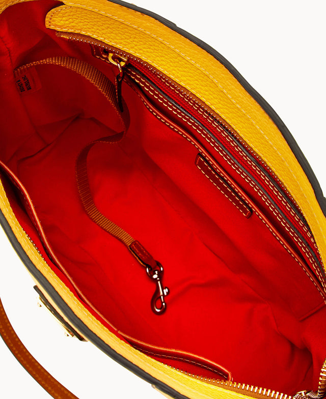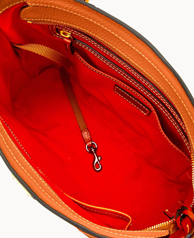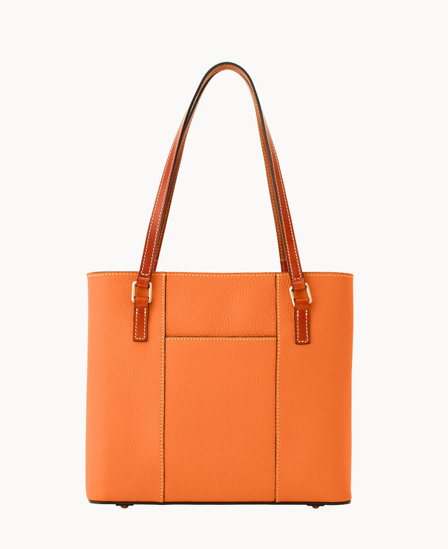 This essential tote, made from long-lasting pebble leather with a rich finish, has all the features you need: protective feet on the bottom, an exterior slip pocket, comfortable leather straps, and a zippered closure for security.Details