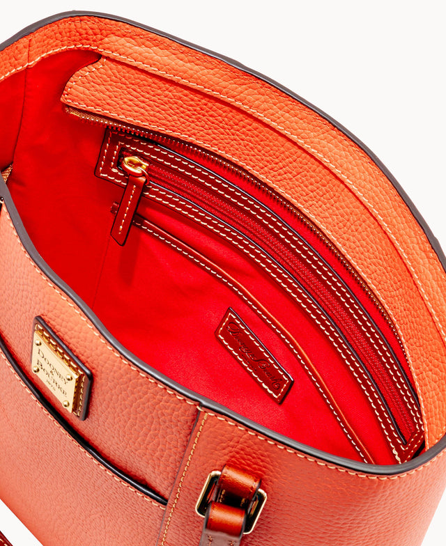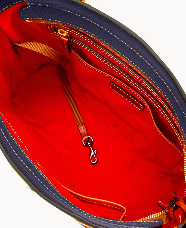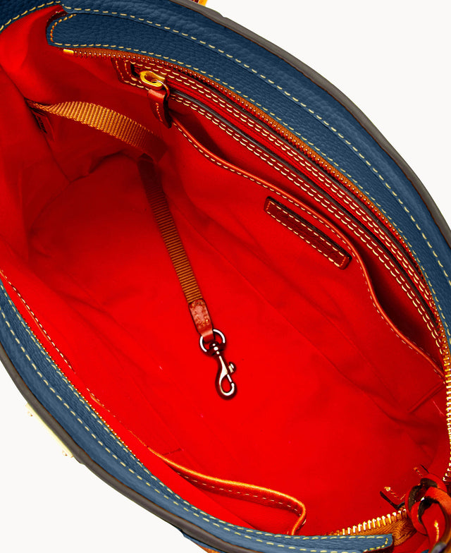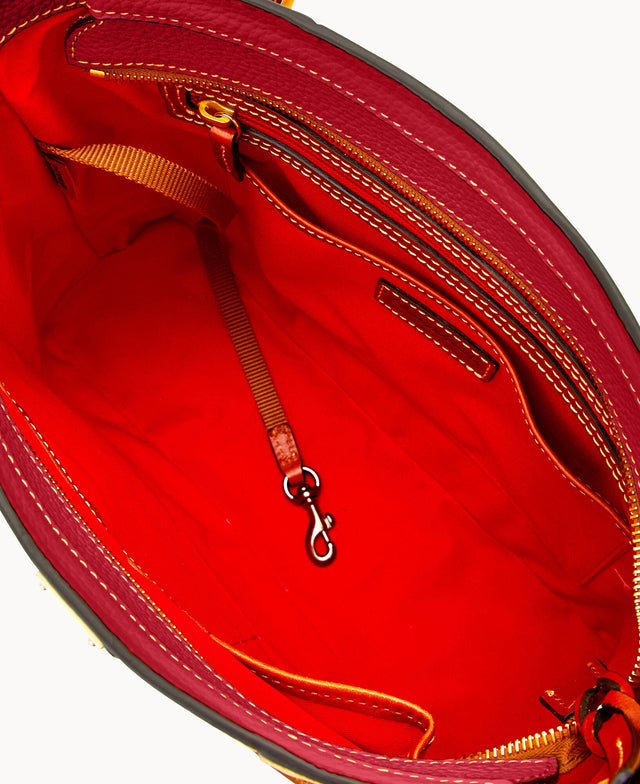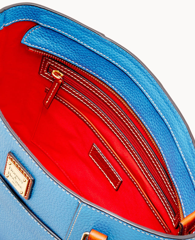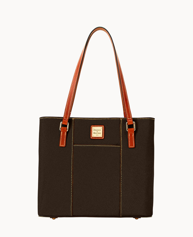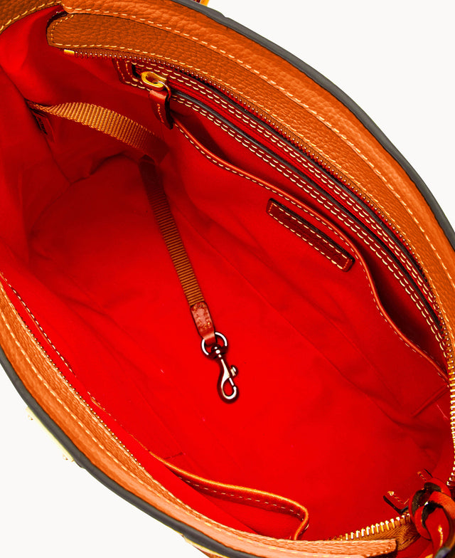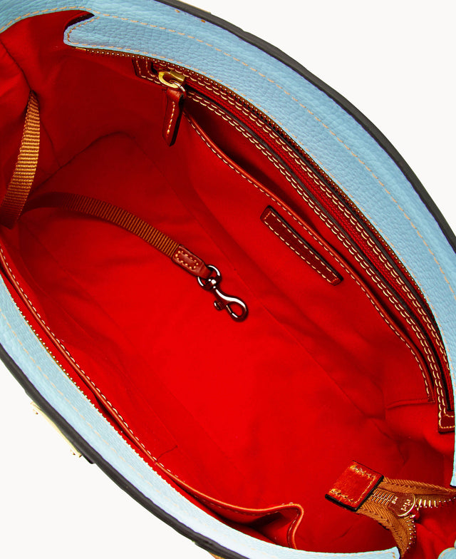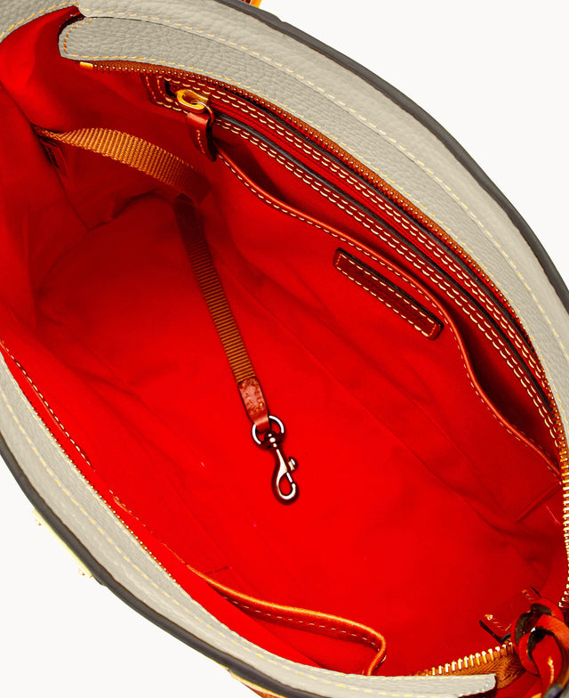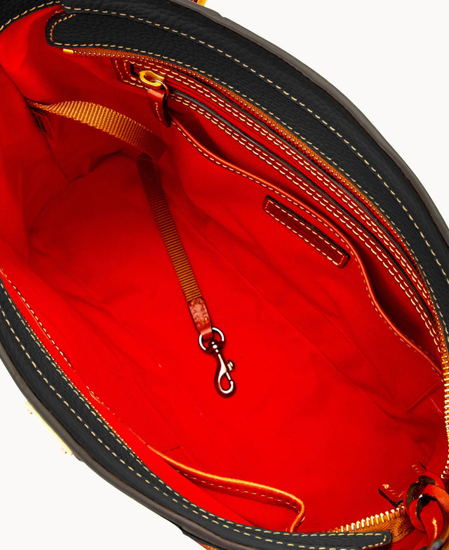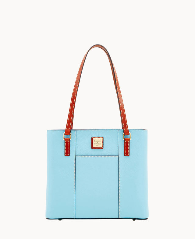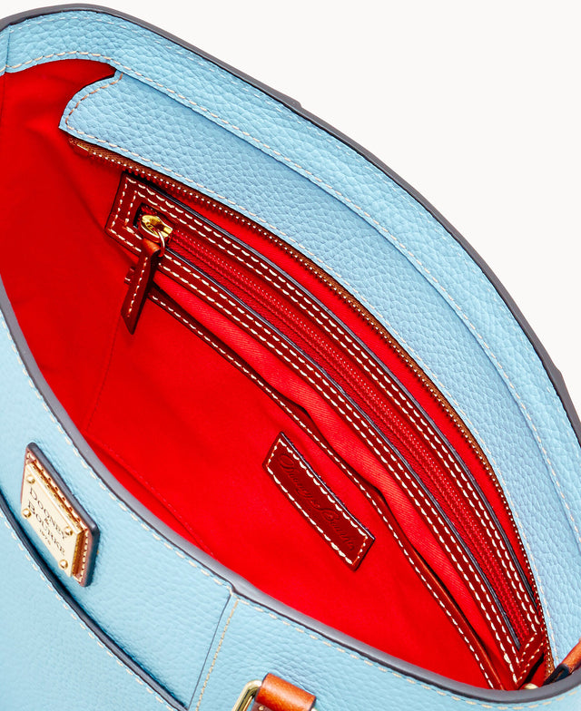 This essential tote, made from long-lasting pebble leather with a rich finish, has all the features you need: protective feet on the bottom, an exterior slip pocket, comfortable leather straps, and a zippered closure for security.Details