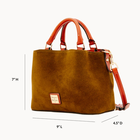 Dooney & Bourke's Suede Collection has been treated for general water repellency. However, some water absorption is possible within excessive water conditions. If this happens, a dry cloth should be used to blot the excess liquid and the material should be allowed to dry thoroughly. Once dry, a suede brush should be used to gently lift the nap